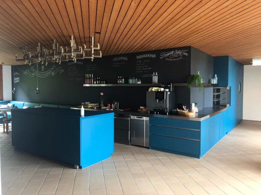 Diese Küche in einem öffentlichen Gebäude besticht durch ihr modernes, sachliches Design. Die blauen Fronten verleihen dem Raum eine frische, kühle Note und schaffen eine ansprechende Atmosphäre, die sowohl einladend als auch professionell wirkt. Die Edelstahlabdeckung ergänzt das Gesamtbild perfekt und sorgt für eine robuste, pflegeleichte Oberfläche, die den Anforderungen des täglichen Gebrauchs standhält. Ein besonderes Highlight ist die Rückwand im Kreidetafel-Look, die Platz für die Getränkekarte bietet und der Küche einen Hauch von Verspieltheit verleiht.