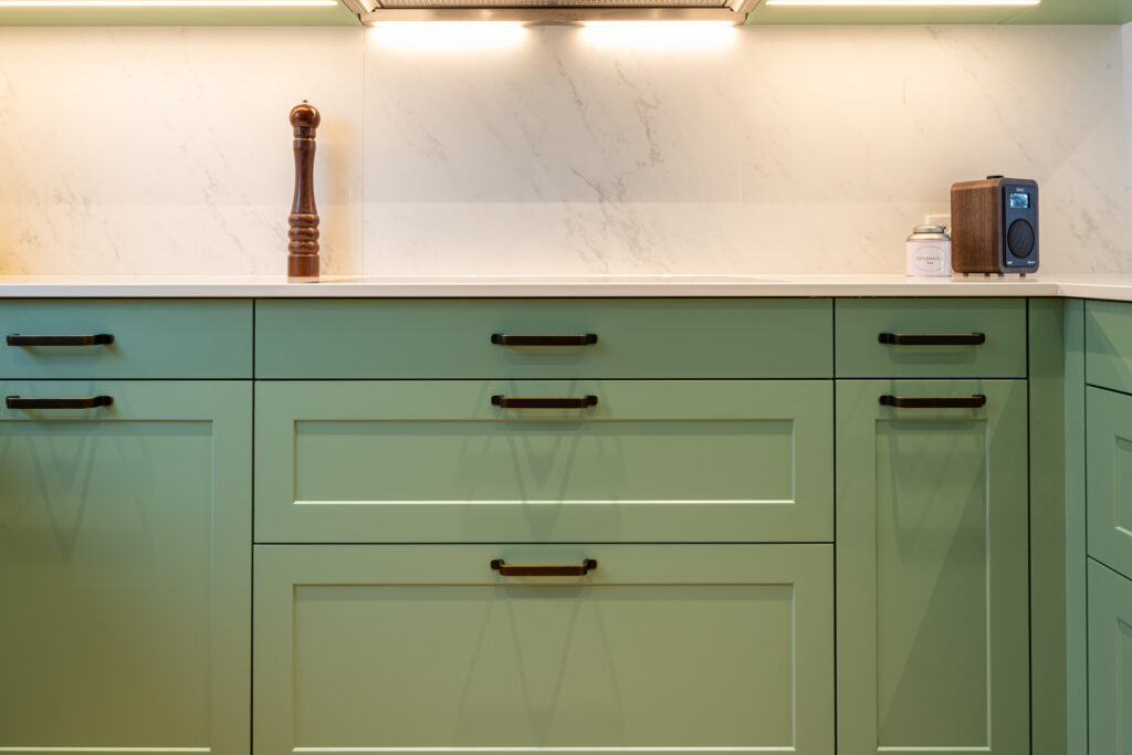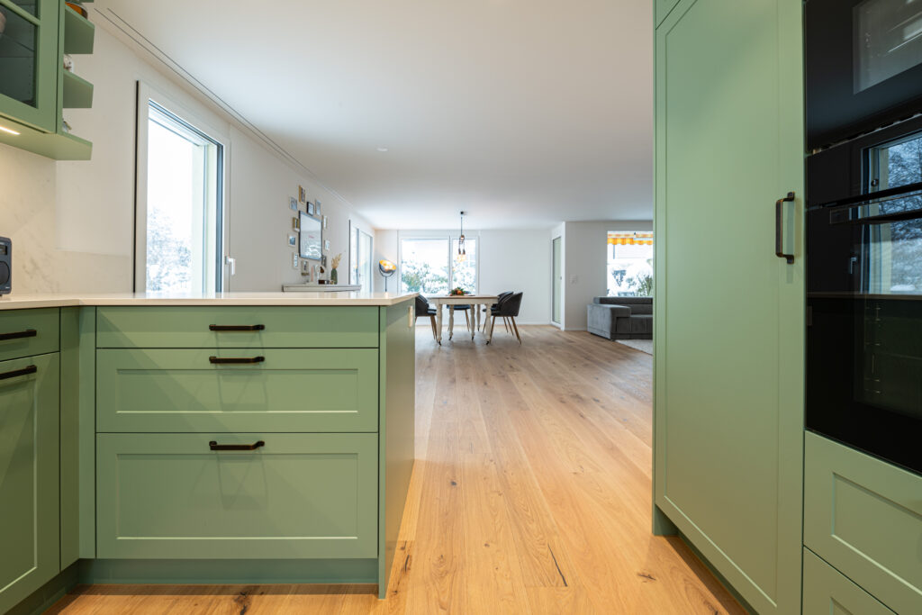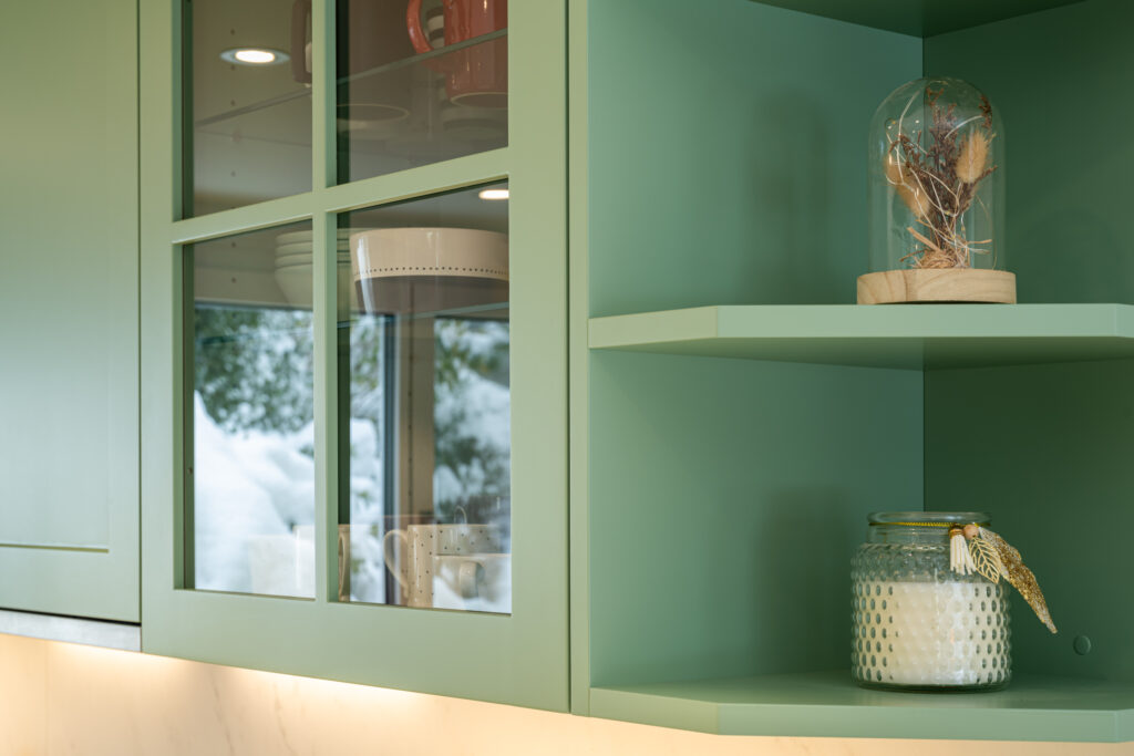 Sie begeistert mit ihren charmanten grünen Fronten, die eine frische und lebendige Atmosphäre schaffen und dem Raum Charakter und Individualität verleihen.