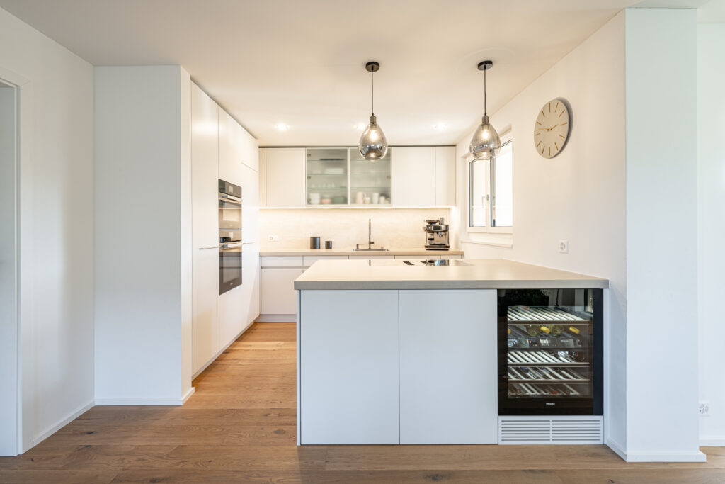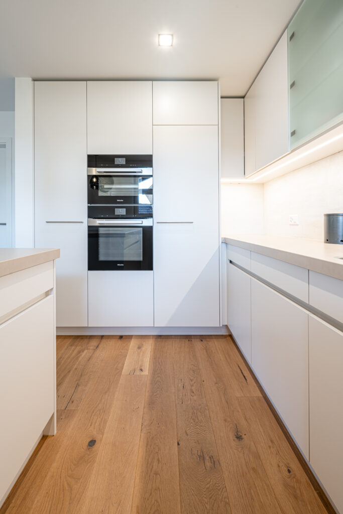 Die weiss lackierten Küchenfronten mit Griffprofilen und die hochwertige Abdeckung aus Keramik verleihen dem Raum zeitlose Eleganz, während der warme Eichenparkett für eine gemütliche Atmosphäre sorgt. Ein harmonisches Zusammenspiel von modernen Materialien und klassischem Design, das zum Kochen und Verweilen einlädt!