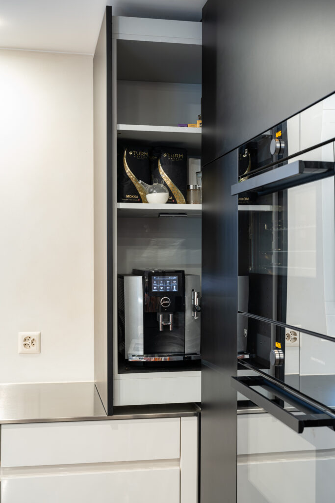Entdecken Sie die perfekte Lösung für eine aufgeräumte Küche! Dieser elegante Küchenauszug für Ihre Kaffeemaschine ermöglicht es Ihnen, die Maschine bei Bedarf einfach herauszuziehen und nach dem Gebrauch wieder zu verstauen.